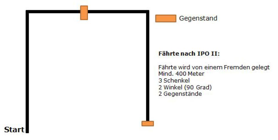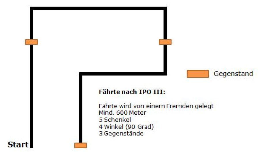 Die Fährte wird auch durch eine Fremdperson gelegt. Sie muss mindestens 600 Meter sein und 5 Schenkel sowie 4 Winkel (90°) enthalten. Es gilt nun anstatt 2 Gegenstände, 3 Gegenstände zu finden und zu verweisen, welche mindestens 60 Minuten vor Suchbeginn gelegt werden müssen. Man hat für die Suche 20 Minuten Zeit.